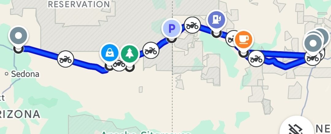 From there, we rode through increasingly scenic stretches of highway before pulling off at the Painted Cliffs Rest Area, just before the Arizona state line. Big skies, layered desert stone, and that “we’re really out here” feeling were all setting in hard.