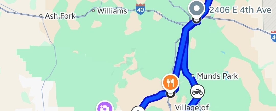 We rolled out of Flagstaff just after 7:00 a.m., greeted by crisp mountain air and sunshine cutting through the tall pines. First stop: breakfast at Denny’s in Camp Verde for some old-school comfort food — nothing fancy, just fuel for the ride ahead.
