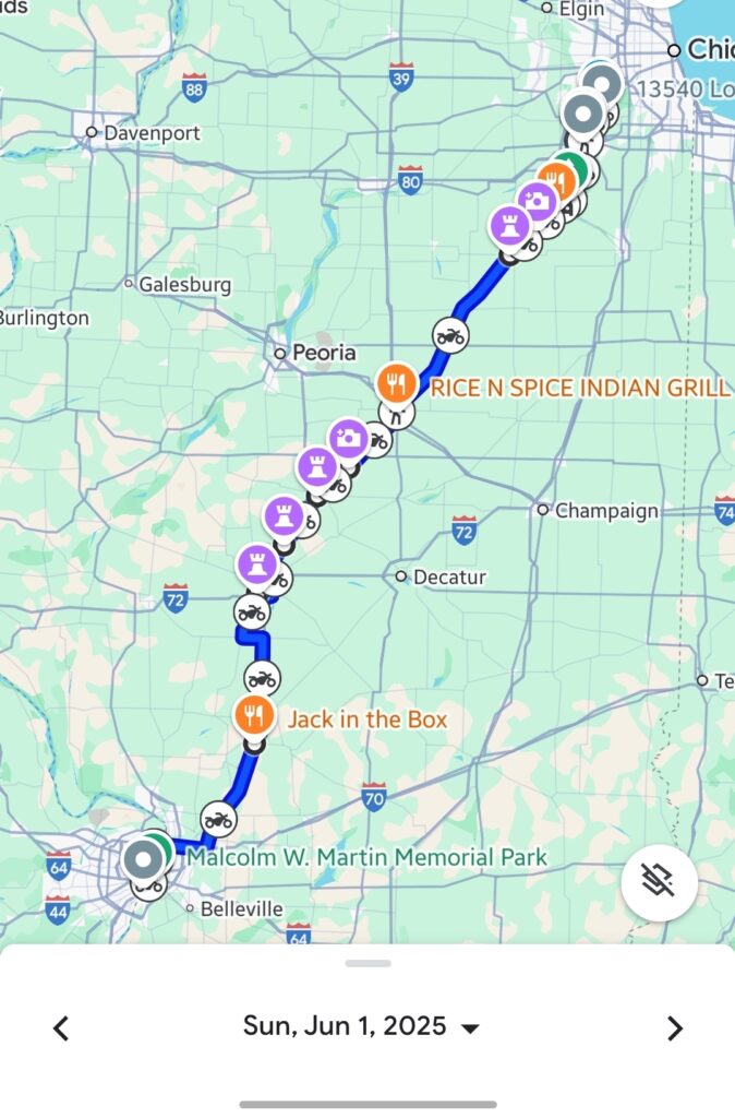 From our base near St. Louis, Missouri, Day 4 was a deep dive into Route 66’s classic Americana. We visited the imposing Old Joliet Prison and posed with the famous Gemini Giant in Wilmington. Lunch at the retro Polk-A-Dot Drive-In fueled our ride through Pontiac, past Ambler’s Texaco Station. The day was packed with giants – from Paul Bunyan in Atlanta to the World’s Largest Covered Wagon in Lincoln and the Lauterbach Muffler Man in Springfield. We ended with a spectacular sunset view of the Gateway Arch from the Mississippi River Overlook in East St. Louis, covering around 490 kilometers (304 miles).