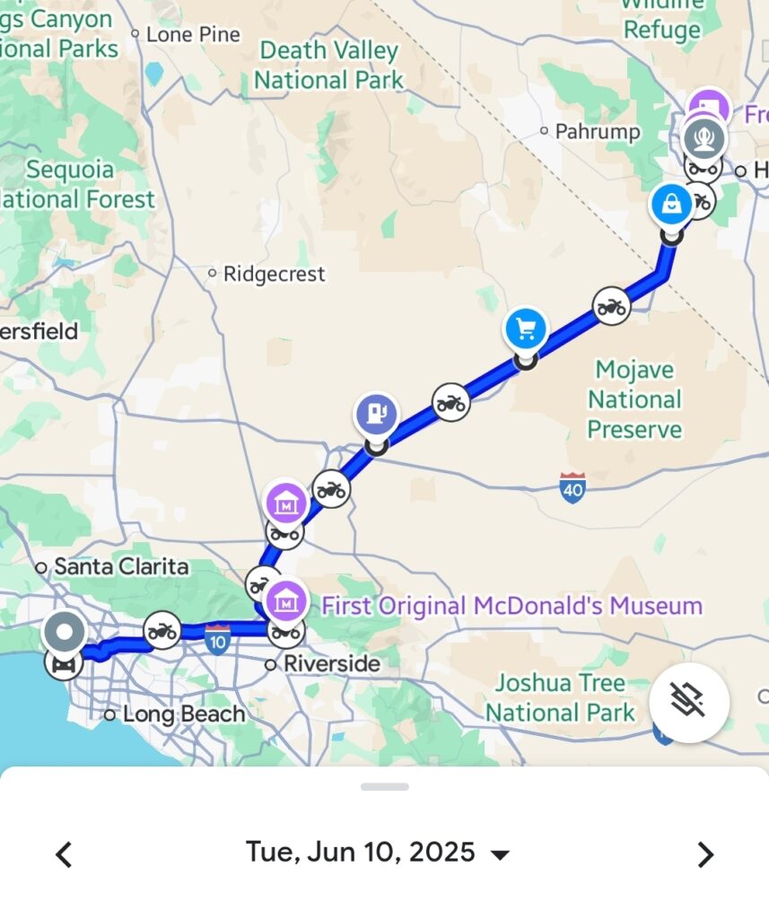 Leaving the bright lights of Las Vegas, Day 12 began our westward push towards the Pacific. Our ride took us through the vast Mojave Desert, following segments of historic Route 66, before finally arriving at the iconic Santa Monica Pier in California. The sight of the Pacific Ocean and the lively atmosphere of Pacific Park were a fitting reward after riding approximately 427 kilometers (265 miles).