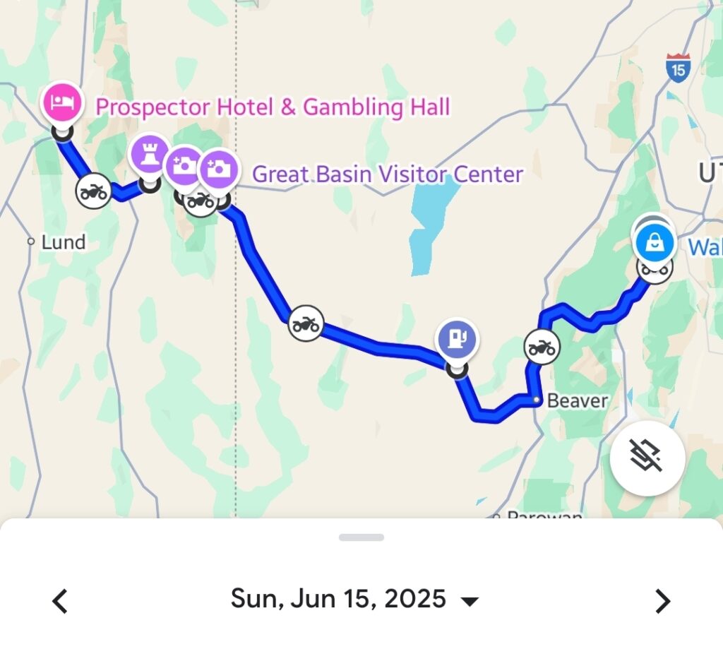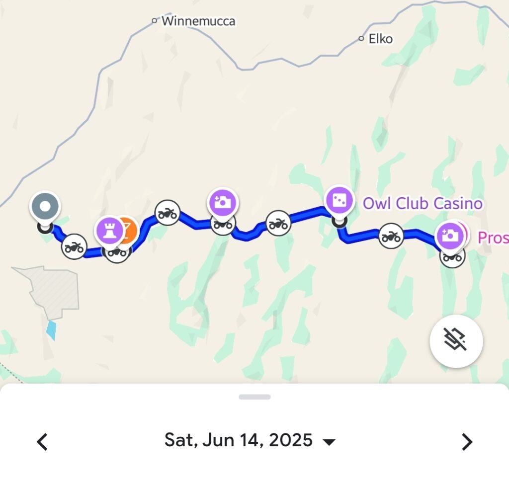 Leaving the beauty of Lake Tahoe, Day 16 saw us plunge into the vast, stark landscapes of Nevada, specifically tackling “The Loneliest Road in America” (US-50). We experienced quirky stops like Middlegate Station, explored the intriguing Stokes Castle, and found respite at places like the Owl Club Casino. Our long ride, covering around 465 kilometers (289 miles), ended in Ely, Nevada, at the Prospector Hotel & Gambling Hall.