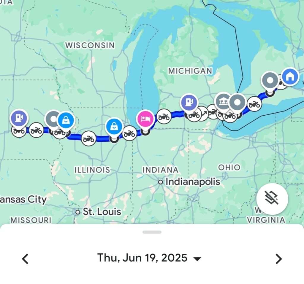 Our epic journey kicked off from our starting point in Southern Ontario, as we geared up and made our way across the border. The excitement was palpable as we cleared customs at the Ambassador Plaza, officially beginning our American adventure. After a solid day of riding, we settled in at Homer Glen, Illinois, marking our first successful day on the road, covering approximately 400 kilometers (272 miles).