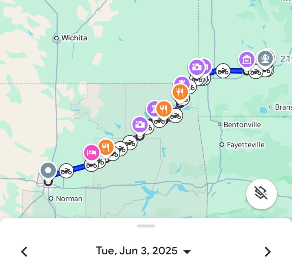 Day 3 saw us truly embrace the spirit of Historic Route 66. Leaving Homer Glen, we dived into the iconic Mother Road, exploring fascinating stops like the mysterious Meramec Caverns and the delightfully bizarre Uranus Fudge Factory. Our day concluded in Sullivan, Missouri, having ridden roughly 400 kilometers (249 miles).