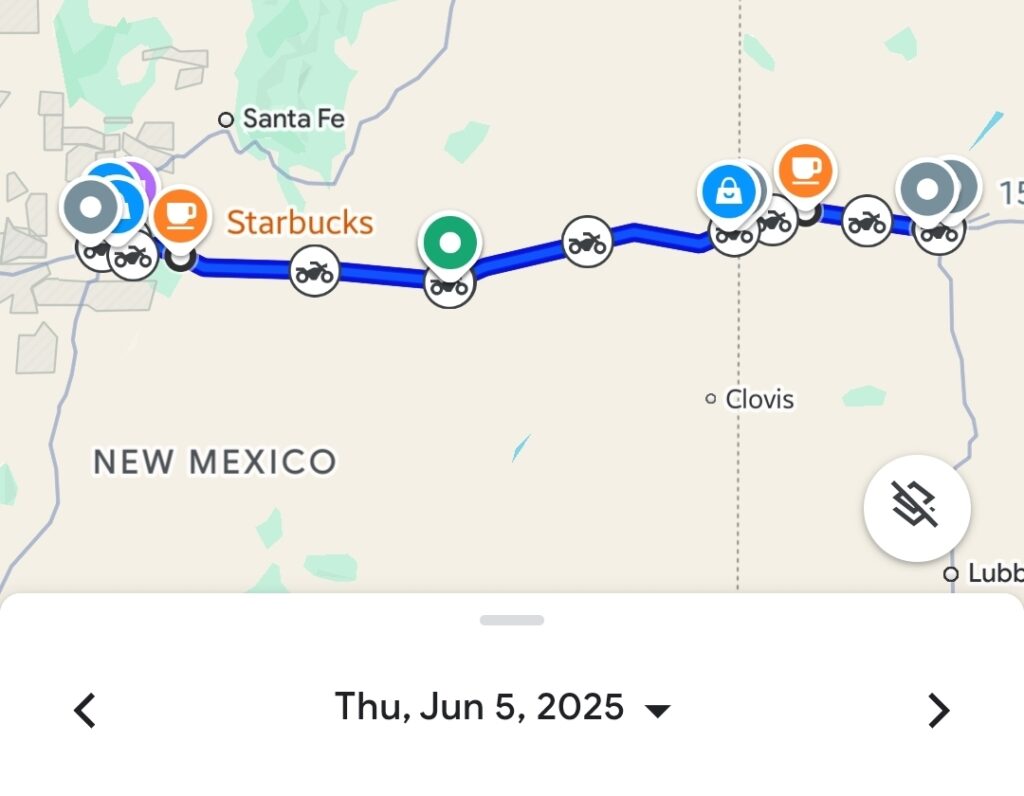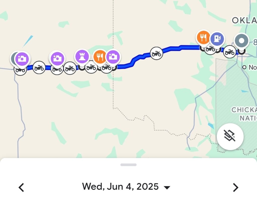 Day 6 truly embodied the spirit of the American Southwest. Starting from Elk City, Oklahoma, we continued our Route 66 pilgrimage, eventually rolling into the vast landscapes of Texas. Highlights included the unique architecture of the U-Drop Inn Cafe and the vibrant artistry of Cadillac Ranch. The day’s ride ended in Amarillo, Texas, with a memorable stop at the famous Big Texan Steak Ranch, covering about 600 kilometers (373 miles).