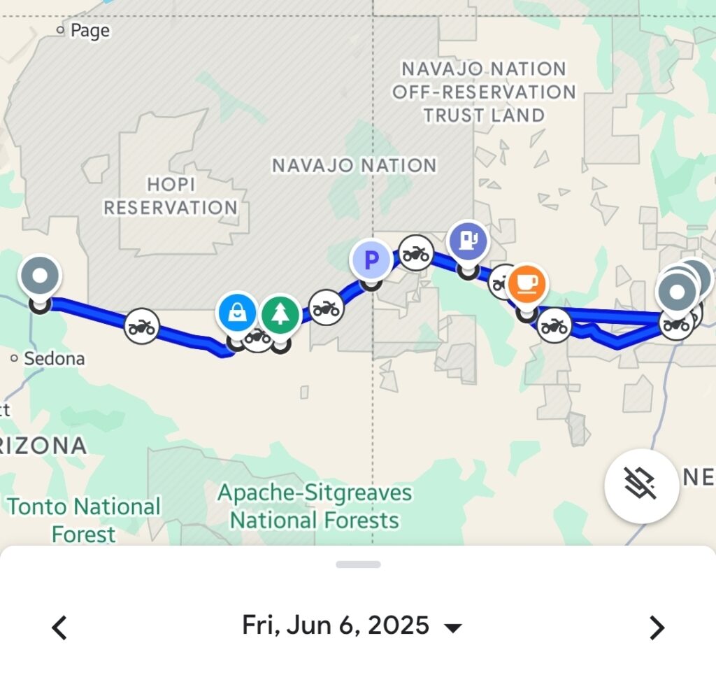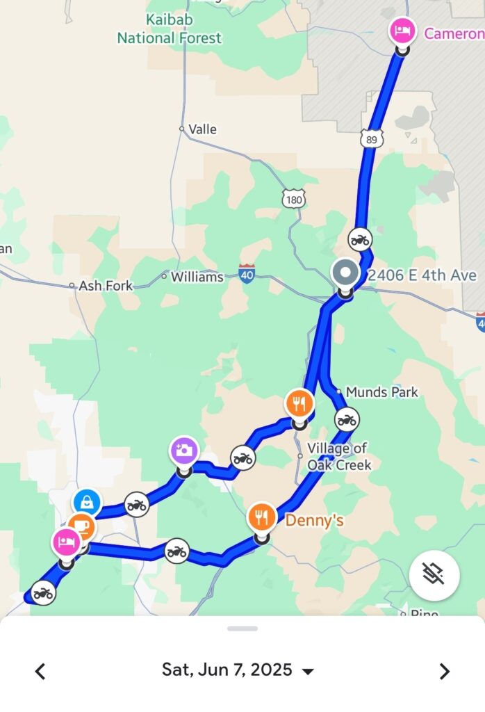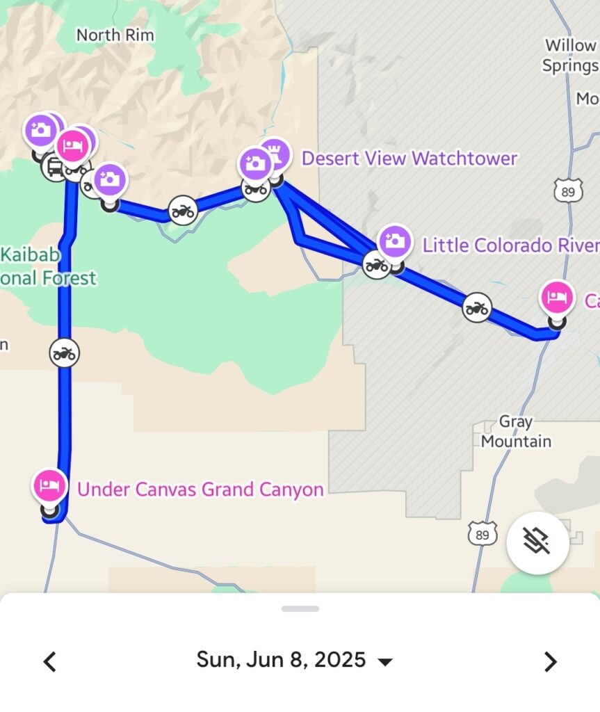 Day 9 saw us continue our ride from Gallup, New Mexico, back into Arizona, with our sights set on the ultimate natural wonder. We enjoyed the open roads, passing by intriguing spots and making practical stops as we edged closer to our grand destination. The day’s ride concluded near the Grand Canyon, settling in near Flagstaff and the Cameron Trading Post, covering around 475 kilometers (295 miles).