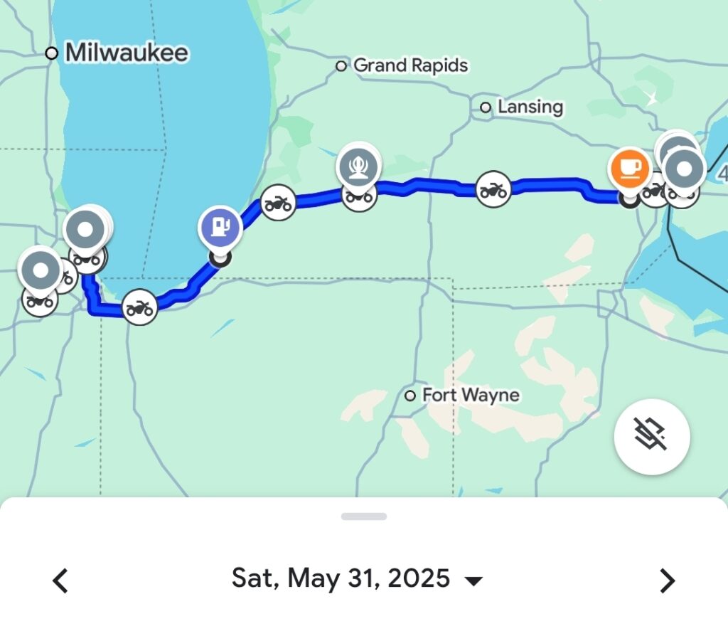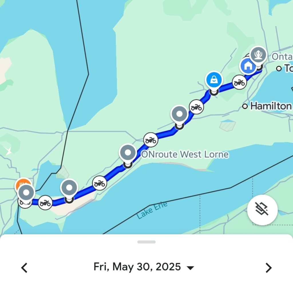 Day 1, wasn’t the start of Route 66, but the vital first leg of getting to our official starting line in Chicago. Our engines roared to life bright and early from our home base in Brampton, Ontario, packed for a long haul. The air was thick with anticipation, the hum of eight machines a prelude to the thousands of kilometers ahead. Our initial target: Windsor, Ontario, a considerable approximately 375 kilometers (233 miles) away, strategically positioning us for the border crossing and the onward push towards Illinois.