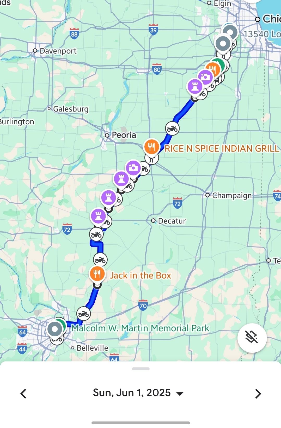 Distance covered by motorcycle: ~490 kmRoute: Homer Glen, IL → Joliet → Wilmington → Pontiac → Atlanta → Springfield → St. Louis, MO Day 3 marked the crew’s first full day riding on Historic Route 66, and it didn’t disappoint. The journey was packed with classic Americana, roadside legends, vintage diners, and quirky photo ops