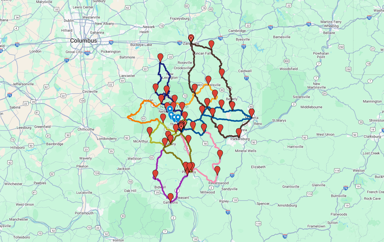 I’ve created a custom Google Maps route for the Ohio Windy 9 – a series of scenic motorcycle and driving routes through southeastern Ohio known for their winding roads and beautiful countryside. Since I couldn’t find an existing comprehensive map online, I decided to piece it together myself. This map is meant as a general