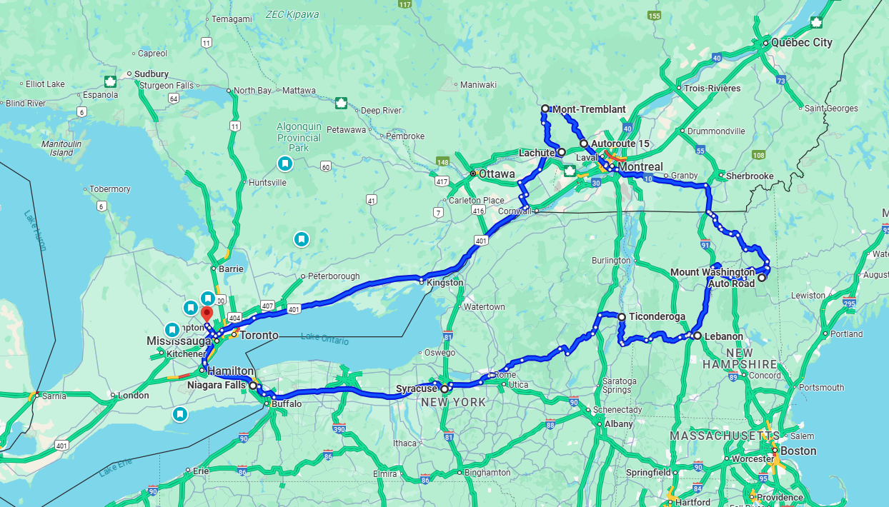 Day 1: Brampton, ON → Mont-Tremblant, QC → Near Montreal Distance: ~600 km | Time: 7 hours Day 2: Montreal, QC → Mount Washington, NH → Lebanon, NH Distance: ~450 km | Time: 6 hours + stops Mount Washington Auto Road: The Ultimate Motorcycle Challenge Day 3: Lebanon, NH → Brampton, ON (via Niagara Falls)